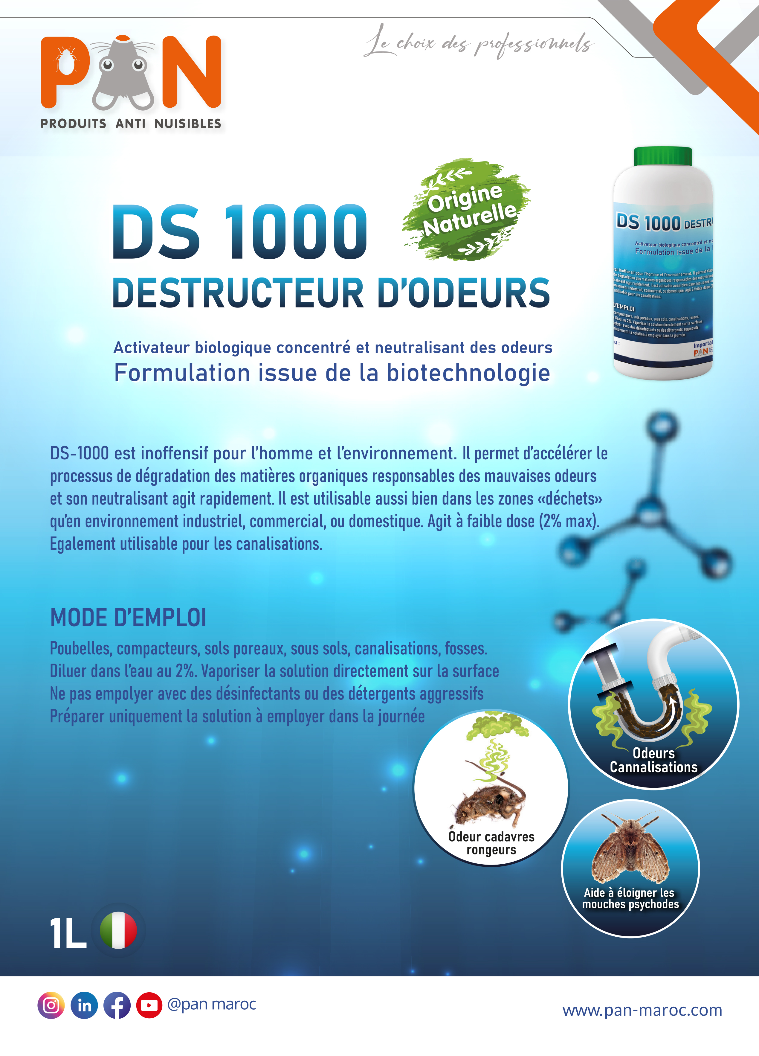 DS-1000 est inoffensif pour l'homme et l'environnement. Il permet d’accélérer le processus de dégradation des matières organiques responsables des mauvaises odeurs et son neutralisant agit rapidement. Il est utilisable aussi bien dans les zones « déchets » qu’en environnement industriel, commercial, ou domestique. Agit à faible dose (2% max).