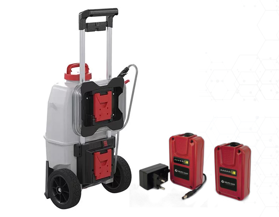 Il intègre tout ce dont un professionnel de l’hygiène 3D a besoin, Il permet l'intégration de roues tout-terrain plus larges, de 3 compartiments étanches (buses, batterie en fonctionnement et seconde batterie), ainsi qu'un support solide empêchant le contact direct du réservoir avec le sol (moins de chocs et de risques de perforation), une cuve généreuse de 35 litres et une autonomie record avec les 2 batteries 2600 mAh Lithium-Ion LiCoO2 18V fournies de série!